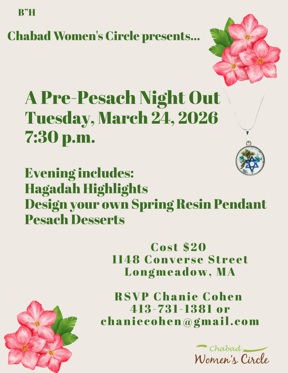 Chabad Women invite you to a grand Pre-Pesach Night Out on Tuesday, March 24, 2026 at 7:30 p.m. at LYA, 1148 Converse Street. Create your own resin spring pendant and enjoy hagada highlights in preparation for Passover.