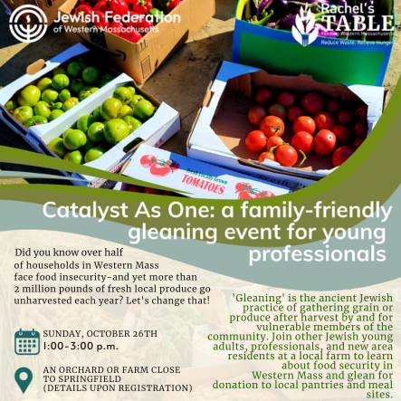 Glean local produce from a farm close to Springfield - details provided upon registration. 'Gleaning' is the ancient Jewish practice of gathering grain or produce after harvest by and for vulnerable members of the community. Join other Jewish young adults, professionals, and new area residents at a local farm to learn about food security in Western Mass and glean for donation to local pantries and meal sites. Please register by October 20.