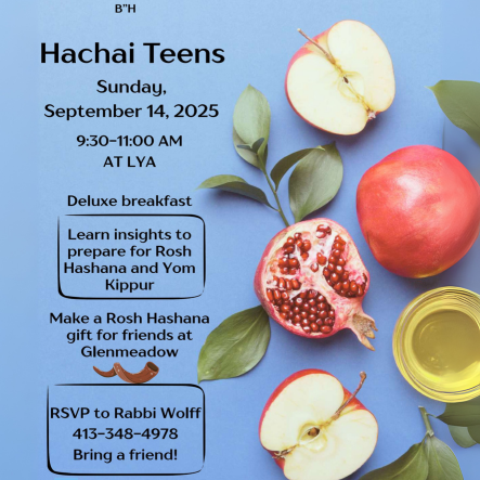 Teens are invited for breakfast, conversation about the High Holidays, and creating Rosh Hashana gifts for friends at Glenmeadow. Teens are welcome to try Hachai for one event before registering for the year. RSVP required by Friday, September 12 at 2:00 pm.