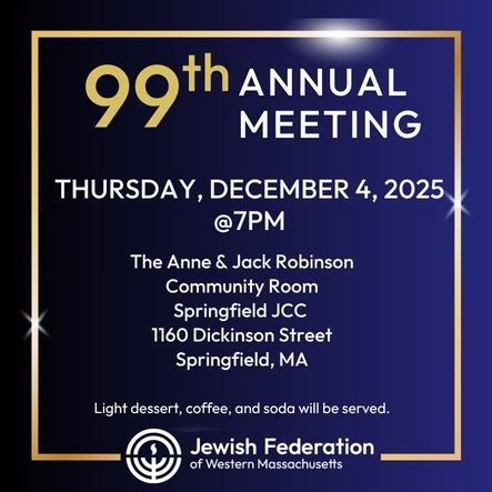 Please join the Western Massachusetts Jewish community for our 99th Annual Meeting. The meeting will be held at The Anne & Jack Robinson Community Room at the Springfield JCC. Light dessert, coffee, and soda will be served. Registration required.