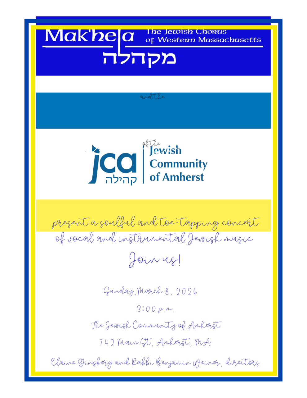 Sponsor: Jewish Community of Amherst and Mak’hela, the Jewish Chorus of Western Massachusetts