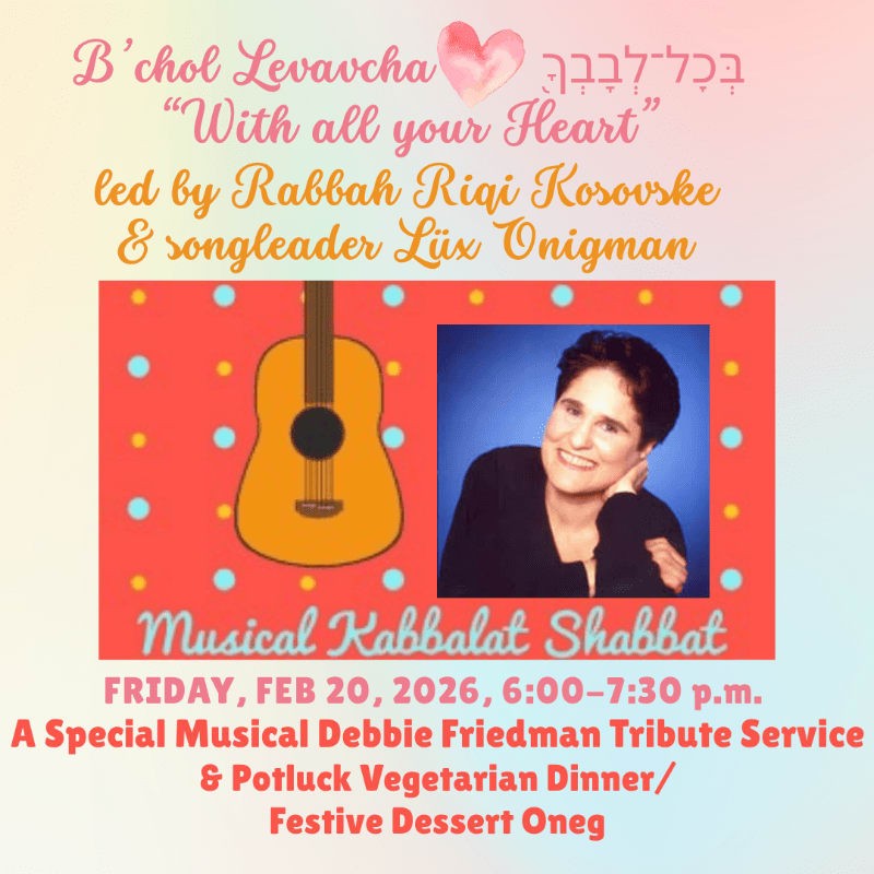 Join Beit Ahavah for B'chol Levavchah - With all your Heart - our new monthly Musical Shabbat Service, led by Rabbah Riqi and songleader Lūx Onigman. Lux is a Jewish educator and senior at Smith College.