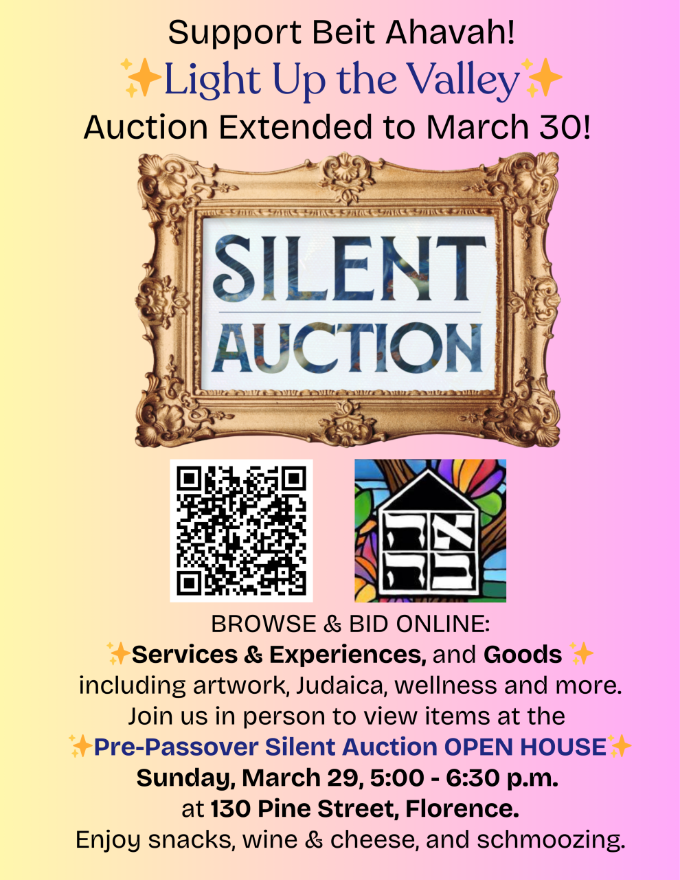 Not only that, but we are also hosting a pre-Passover Silent Auction OPEN HOUSE Celebration on Sunday, March 29 from 5:00 p.m. - 6:30 p.m.