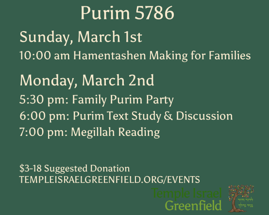 Join the Temple Israel Community for kids crafts, learning, Megillah and hamantaschen!