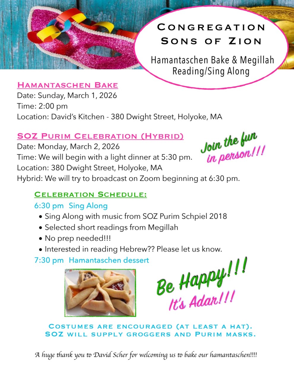 Hybrid: We will try to broadcast on Zoom beginning at 6:30 pm, but the event will start at 5:30 pm for those who attend in-person. Please contact us at office@sonofzionholyoke.org if you would like the Zoom link.
