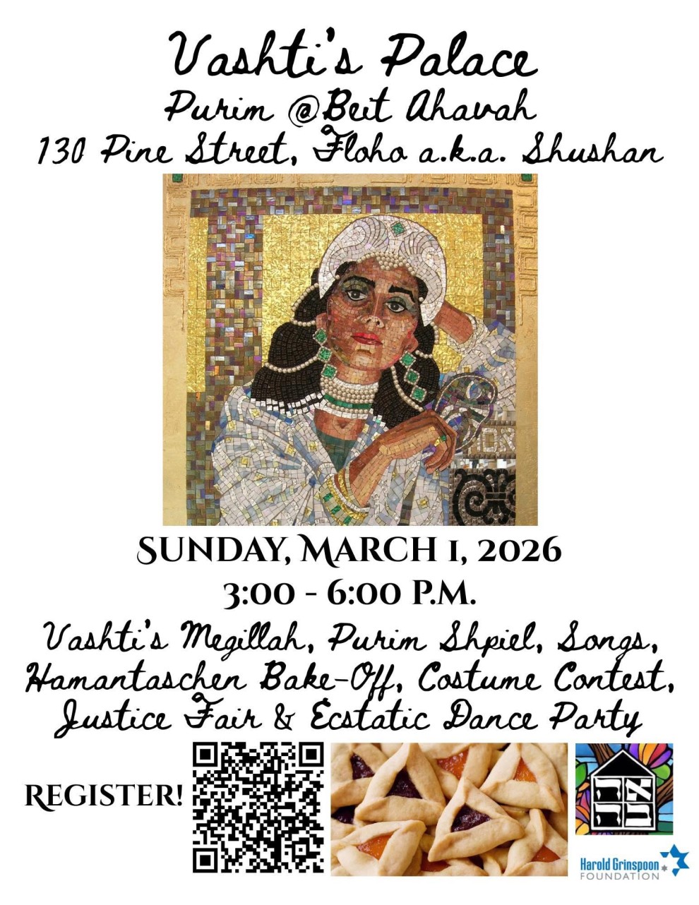 Down in Floho a.k.a. Shushan, we’re inviting you to keep on dancing, protesting and celebrating in Vashti’s Palace @Beit Ahavah, 130 Pine Street — A Vashti Megillah, Shpiel, Hamantaschen Bake-Off, Costume Contest, Justice Fair & Ecstatic Dance Party with DJ Bibi in Vashti’s Palace. Register here: https://www.zeffy.com/en-US/ticketing/vashtis-palace-purim-beit-ahavah
